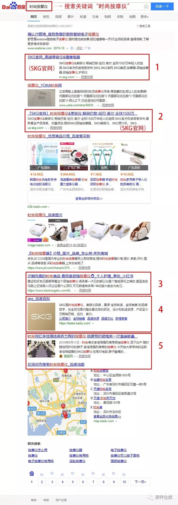 通过上图大家可以看到,这基本上可以算作是一个非常成功的的霸屏,百度首页10条搜索位置,搜索“时尚按摩仪”这个行业词汇,被SKG(即传全媒曾服务过的一个客户)品牌占据了5条。在上图中从上到下的标号依次为: