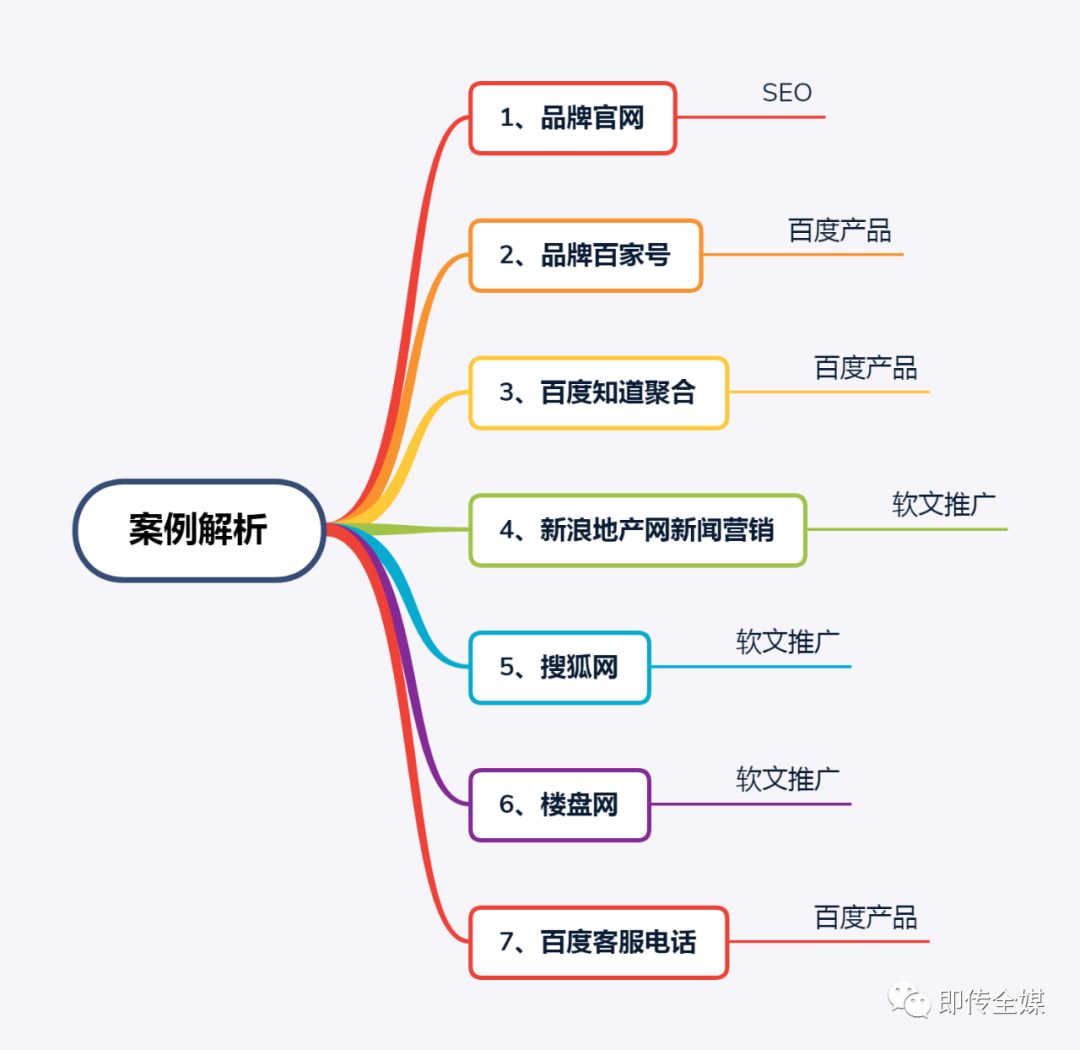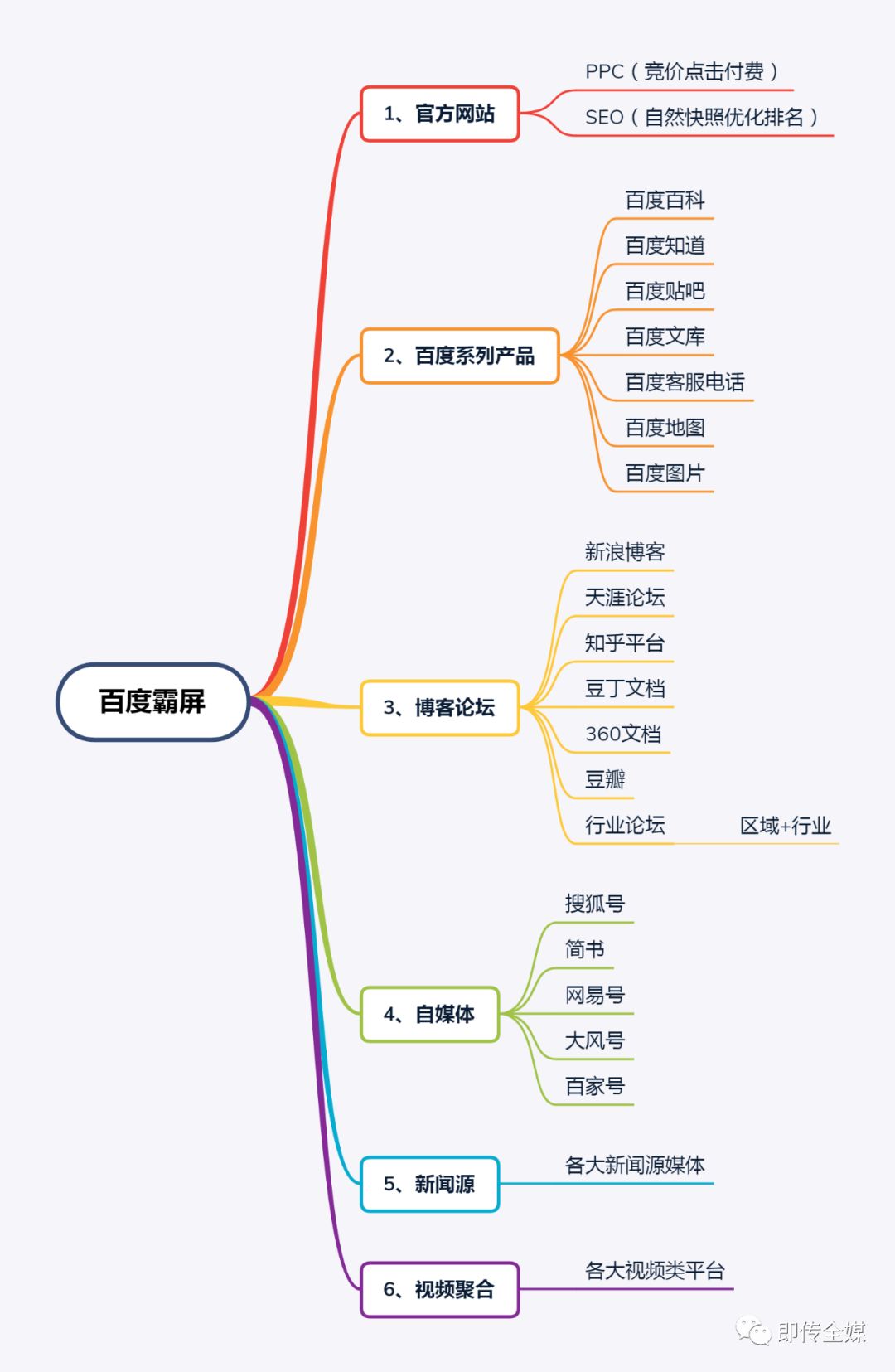 通过上面我们的案例,我们可以得出几个比较重点的渠道:自己的网站(官方网站),百度系列产品(百度全家桶)、新闻源、博客论坛(包含所在行业平台网站)、自媒体渠道,分类信息(含B2B)网站、视频系。如下图: